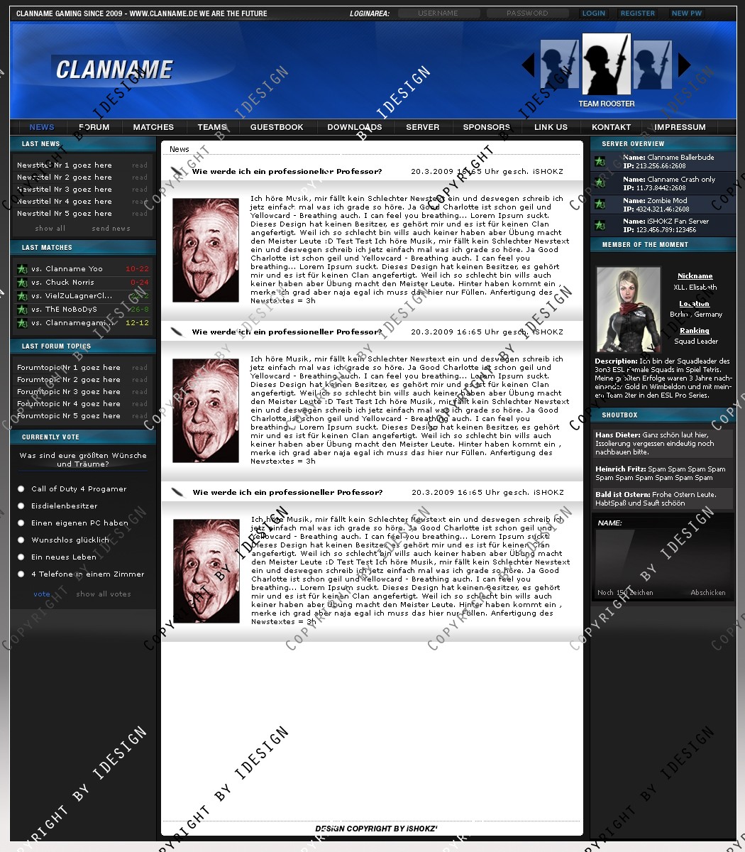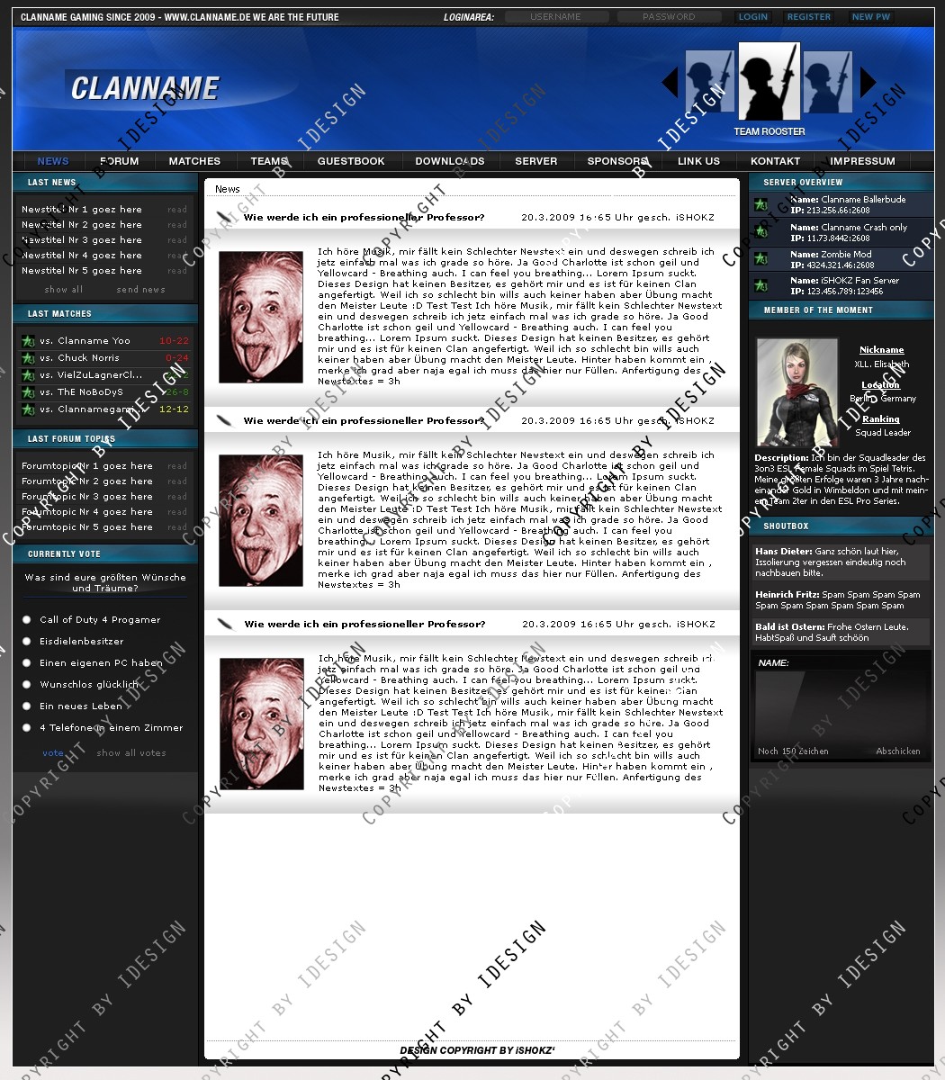 Dies ist ein professionelles Clandesign. Eine übersichtliche und geordnete psd Datei mit allen vorhandenen Ebenen ist vorhanden. Bei weiteren Fragen oder Support wenden sie sich per E-mail an "[email protected]" Dieses Design gibt es auch in blau. Schaut bei meinen Produkten