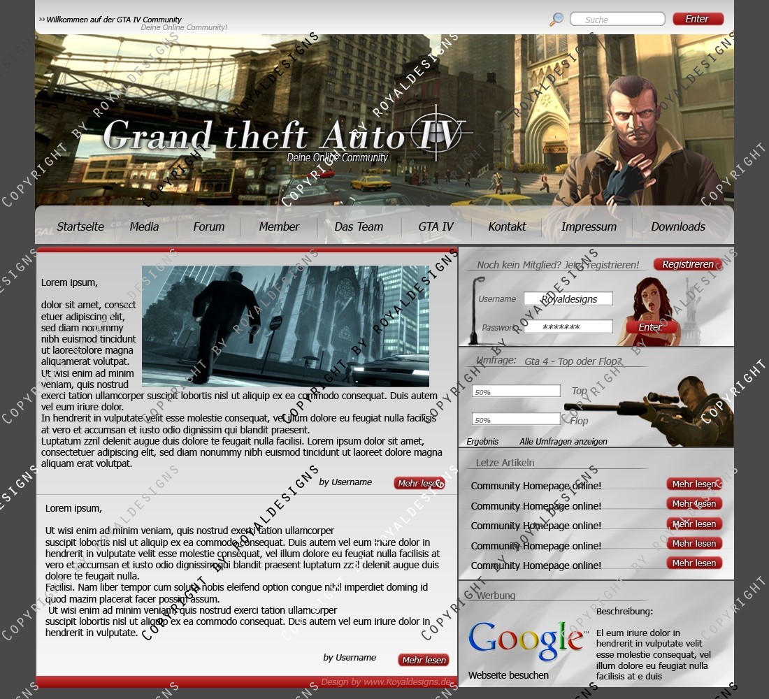 Das Design ist an eine Community angelehnt. Speziell auf eins für das berühmte Spiel des Jahres "Gta IV". Es sind einige elemente eingearbeitet worden, z.b. in dem Loginbereich und weiter runter. Die Gestaltung nimmt die Farben Rot / Weiß an und so ist es geblieben, schlicht und einfach gehalten.Im Packet wären folgende Sachen enthalten: - .psd Datei des Designs - WerbebannerHeader und weitere kleinigkeiten können kostenFREI geändert werden.