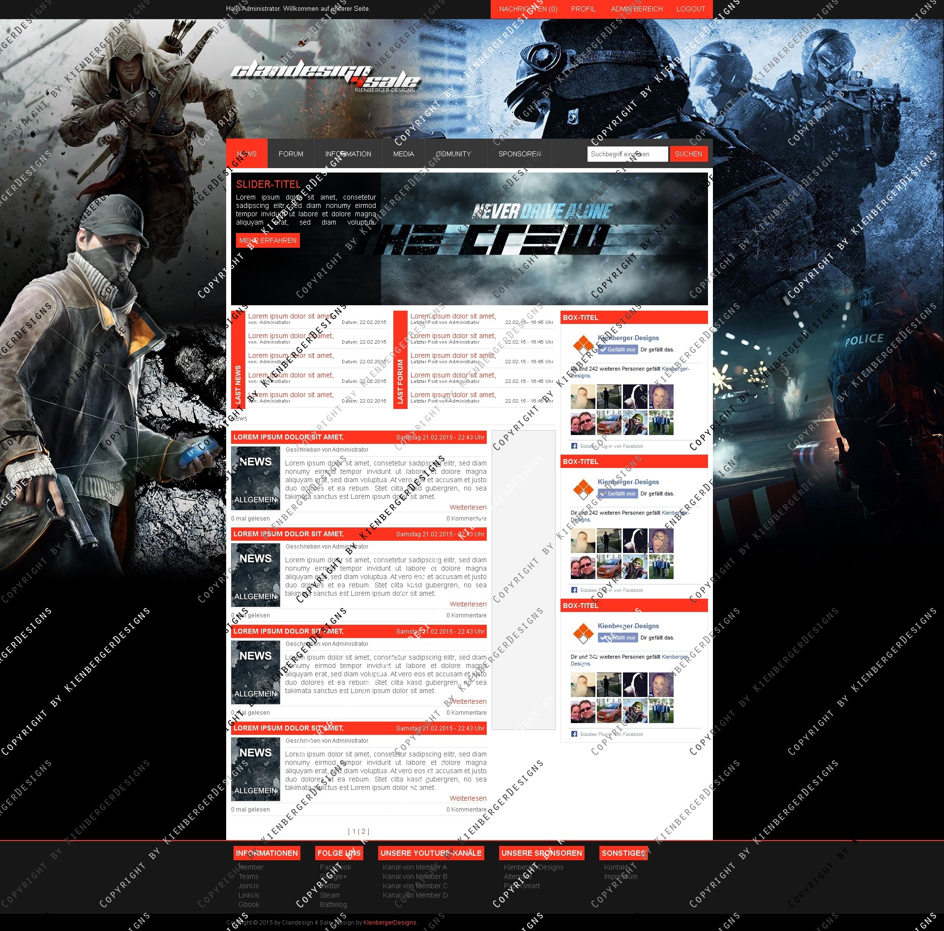 ich biete hier ein frisches, hochwertiges Clandesign in modernen Farben an. Das Design lässt sich einfach slicen und aufgrund des simplen Aufbaus leicht an gängige CMS Systeme wie Webspell und DZCP anpassen. Das Design lässt sich eigenhändig mit allen gängigen Photoshop Version bearbeiten.