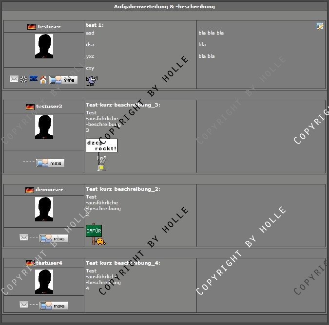Nachdem mich meine Member mehrmals darauf angesprochen haben, wo & wie man denn einen Admin oder Zuständigen für einen bestimmten Bereich im Clan erreichen kann, bin ich auf die Idee gekommen, diese Übersicht dazu zu coden.